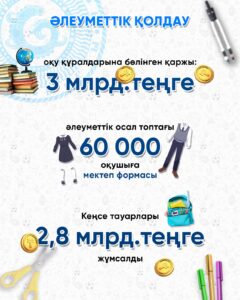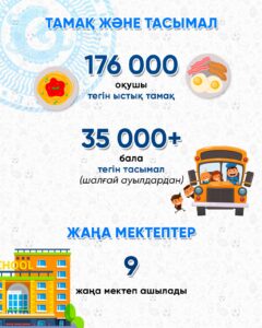 Жаңа оқулықтарға шамамен 3 млрд теңге бөлінді. Әлеуметтік санаттағы 60 мыңнан астам оқушы мектеп формасы мен кеңсе тауарларымен қамтамасыз етіледі. Сондай-ақ облыстағы 176 мың бала тегін ыстық тамақпен, ал 35 мың ауыл оқушысы тамақтың тегін жеткізілуімен қамтылады.