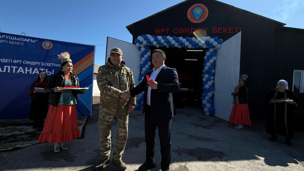 Облыстық төтенше жағдайлар департаментінің бастығы Дәурен Дәулетқанұлы ауыл әкіммі Жәнібек Абиырұлына өрт сөндіру көлігінің кілтін табыстады.