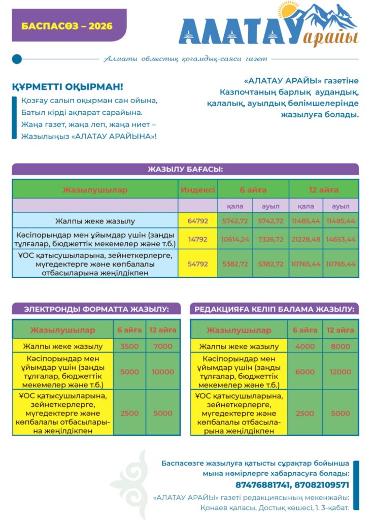 Облысымызда болып жатқан күнделікті оқиғалар туралы жан-жақты ақпарат, сараптама, халықтың тұрмыс-тіршілігі, әлеуметтік мәселелері туралы терең талдау мақалаларын назардан тыс қалдырмайтын “Алатау арайы” газетіне 2026 жылға жазылу жүріп жатыр.